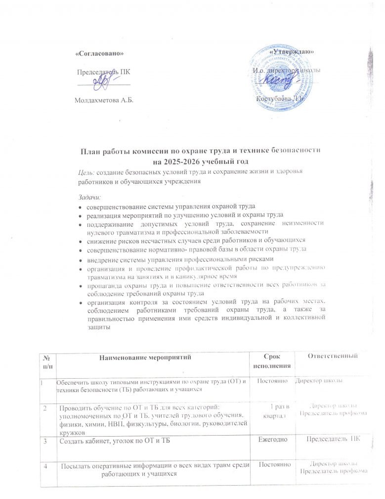 Еңбекті қорғау және қауіпсіздік техникасы жөніндегі комиссияның 2025-2026 оқу жылына арналған жұмыс жоспары.