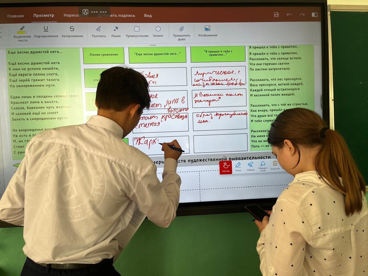 Молдахметова А.Б. жетекшілігімен орыс тілі мен әдебиеті сабақтарында тач-панельді қолдану 5–11-сынып оқушыларының оқу үрдісіне қызығушылығын айтарлықтай арттырады. Панельдің интерактивті мүмкіндіктері тапсырмаларды қызықты да динамикалық форматта орындауға жағдай жасайды: оқушылар экранға шығып, тілдік жаттығулар орындайды, мәтіндермен жұмыс істейді, ақпаратты салыстырады және топтық шағын жобаларға белсене қатысады.